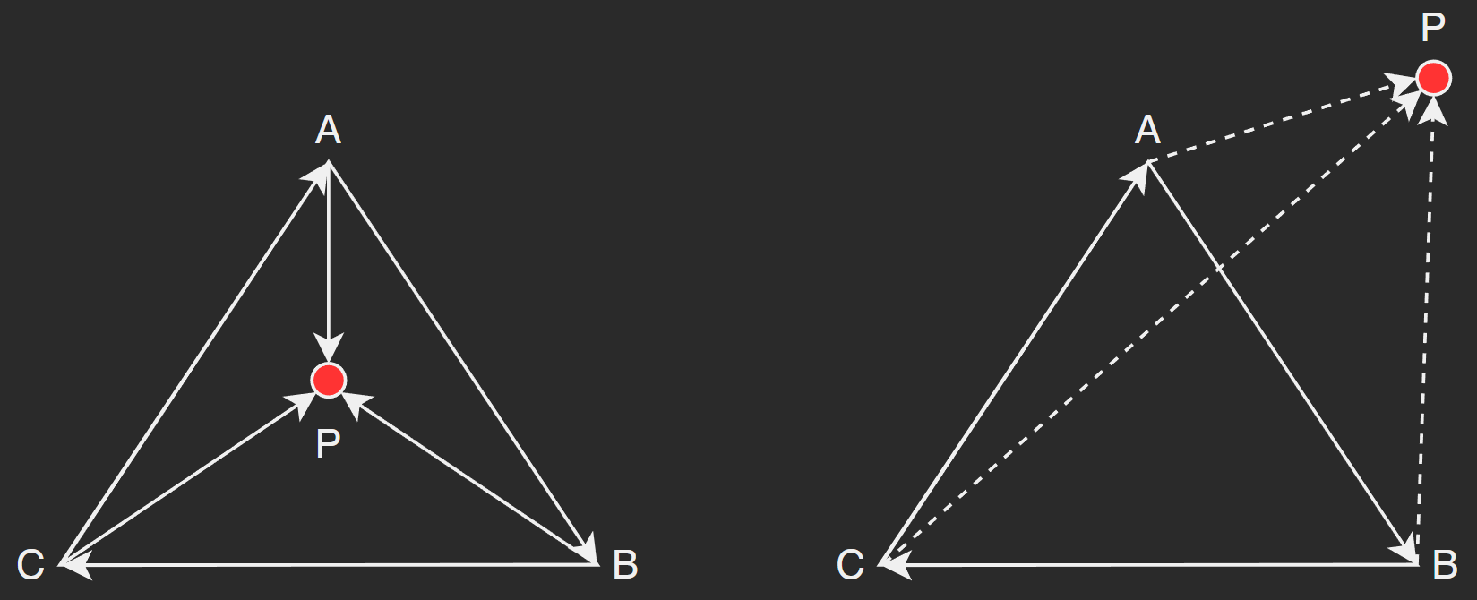 这种方法基于一种简单的观察: 如果点 PPABC\triangle_{ABC} 内部, 那么从分别向量 AB\vec{AB}, BC\vec{BC}, CA\vec{CA} 的方向看, 点 PP 都在 同一侧