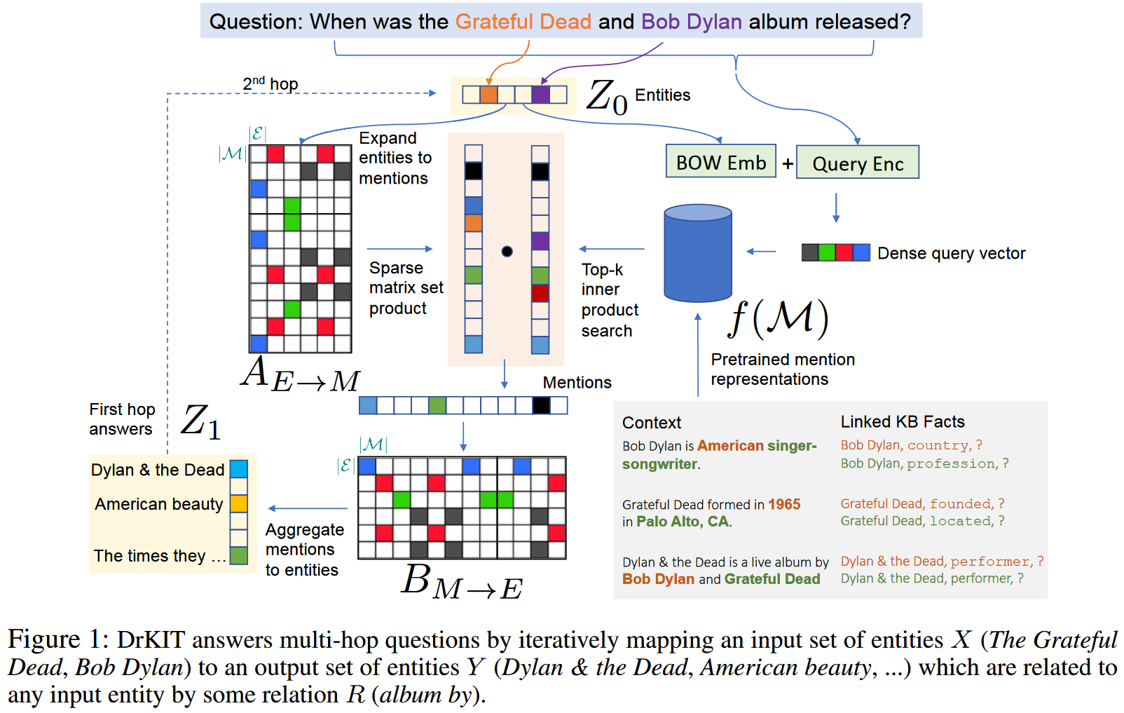 作者首先在语料库上预先提取出所有的实体提及,并为其生成上下文表征,并基于处理的结果制作出实体->提及 以及提及->实体 的映射矩阵。随后在执行问答任务时,首先从问题中提取出涉及到的实体,编码成向量。然后通过与实体->提及 矩阵相乘初步选出提及,随后作者根据整个问题为提及评分,筛选掉与问题不相关的提及。筛选出的结果向量乘以提及->实体 矩阵得到推理的结果实体向量。对于 k-hop 的问题,只需迭代式地执行 k 次上述过程即可得到结果。
